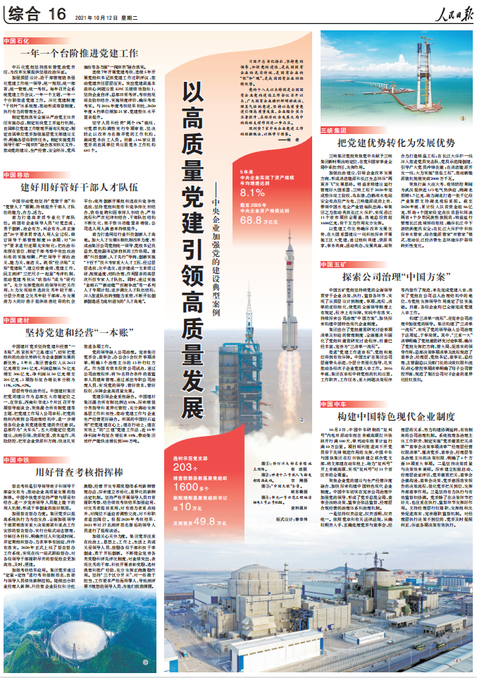 层层传导政治责任。中国建材集团把党的建设作为总部五大功能定位之一,在华东、西南和华北3个片区召开专项督导座谈会,聚焦混合所有制党建等主题,把党建工作写入公司章程,把党的组织内嵌到公司治理结构中,进一步增强各级企业抓党建强党建的责任意识。总部作为“火车头”,五大功能定位党的建设、战略引领、资源配置、资本运作、风险防控,把牢企业资源和方向,快速扎实推进各项工作。